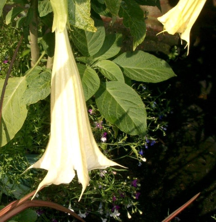 …… or Brugmansia. I wasn’t going to include this plant but it is always intriguing to look at which is which. Ostensibly Daturas are herbaceous plants bearing upright trumpets whereas Brugmansias have woody stems forming shrubs or small trees from which the flowers hang down. This being said, the plant shown is herbaceous, sown as Datura but the flowers hang down? Both are half-hardy at best in a very mild position and generally need moving indoors in the winter.