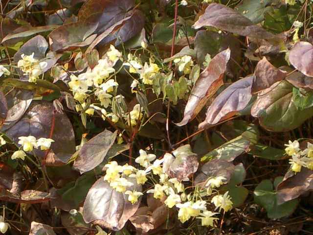 Epimedium x warleyense from the legendary Miss Willmott’s garden was the result of a cross between two western species, the cultivar ‘Orangekonigin’ is a fairly recent introduction. Seems to thrive in either moist or dryish soils. Unfortunately the new foliage pictured had been visited by Mr. Slug!