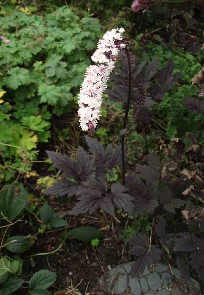 This plant of Actaea simplex ‘Brunette’ suffered very badly from the drought, all the flower spikes, bar this one, drooped never to recover. you can see the brown crinkled leaves to the right of the photo. Also known as Cimicifuga ramosa ‘Brunette’. I look at Actaea rubra and wonder how they can be related.